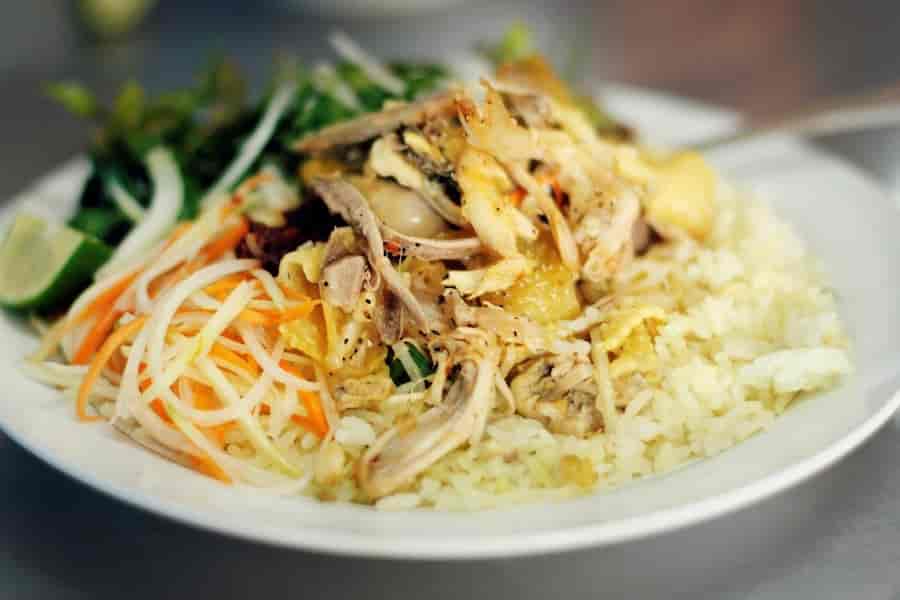 Parmi les ingrédients, il faut citer : riz, safran, poulet, oignons et herbes aromatiques de Tra Que. L’origine de ce plat vient de la communauté chinoise issue de l’île de Hai An et de Canton en Chine. Le terme riz cantonais vous dit quelque chose? Et bien justement le riz frit est une technique qui fait la réputation de ces régions. Bien sûr, quand les Chinois ont débarqué au Vietnam, ils ont incorporé aussi les ingrédients locaux comme le safran et les herbes aromatiques.